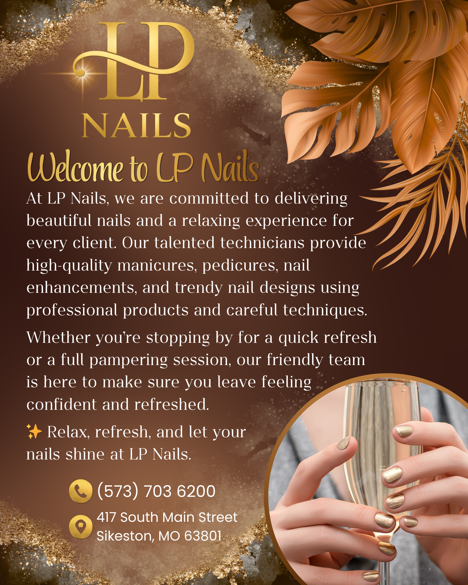 Located conveniently in Sikeston, MO 63801, our nail salon pleased to provide the clean and welcome atmosphere, which will make you freely enjoy the relax moments and escape from all of life’s pressure to make the most of wonderful time.